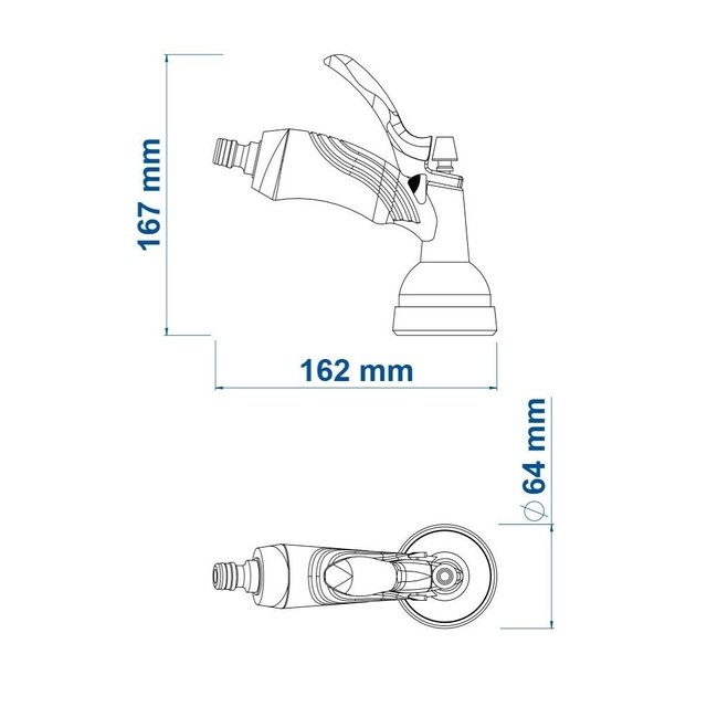 - La hidro pistola se conecta a mangueras de 1/2″, 5/8″ y 3/4″ con sistema de acople rápido.