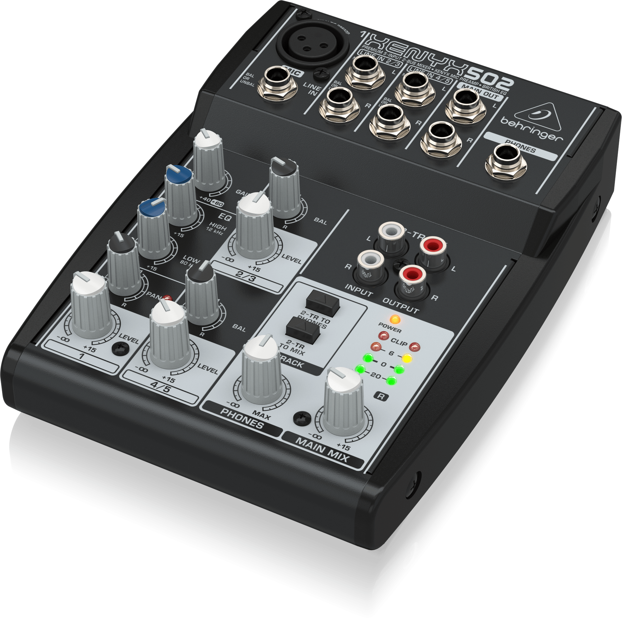 El XENYX 502 de 5 entradas y 2 buses con preamplificador de micrófono XENYX admite micrófonos dinámicos o de condensador. El ecualizador británico de 2 bandas es famoso por su sonido cálido y musical. Reproduce música entre sesiones a través de las entradas RCA de CD/Cinta (asignables a la mezcla principal o a la sala de control/auriculares) y graba tu interpretación en un dispositivo de grabación externo a través de las salidas RCA.